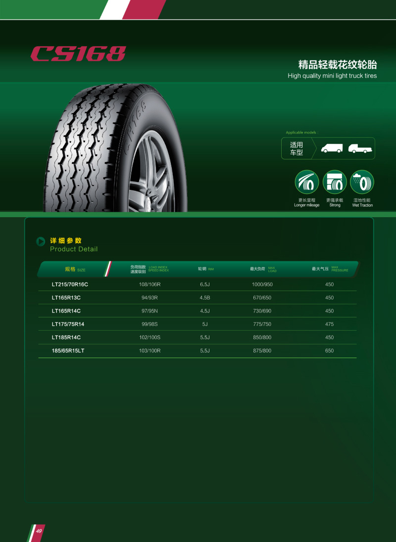 精品輕載花紋曲折的花紋溝槽加雙層胎體結(jié)構(gòu),更強(qiáng)的承載力,深花紋設(shè)計(jì)提供卓越的耐久性能。