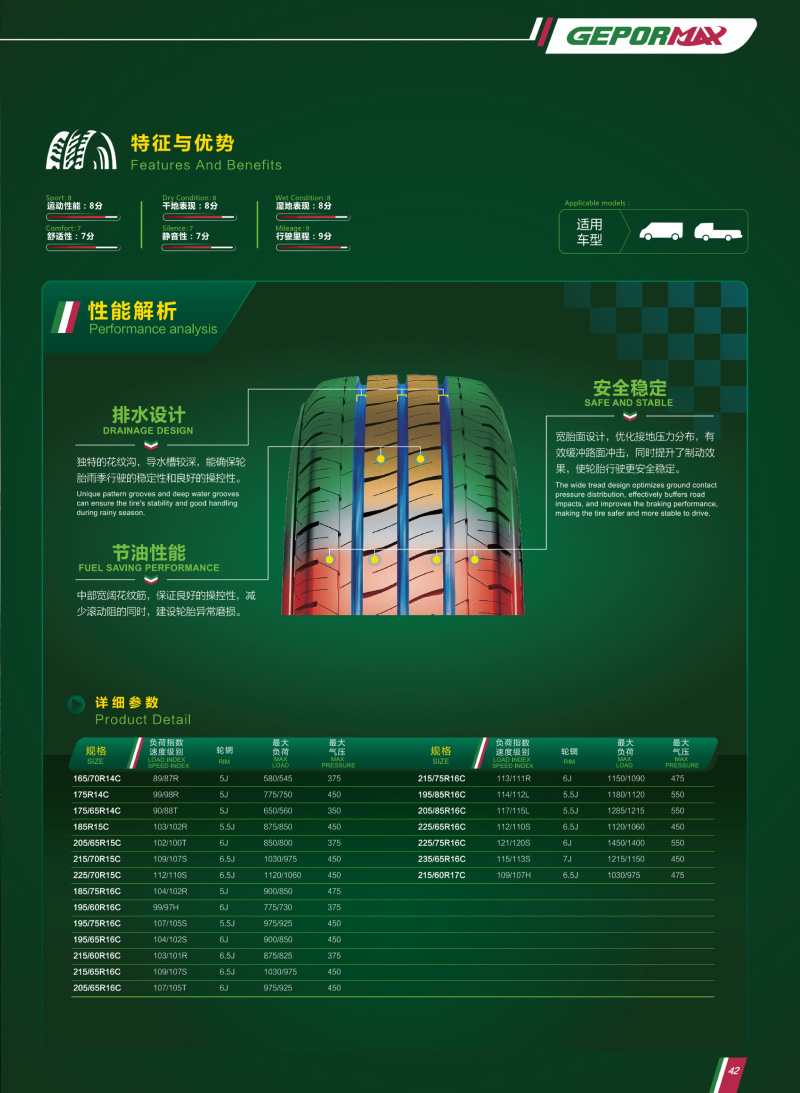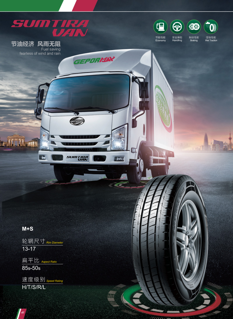 輕型商用車用輪胎,獨特的花紋溝,深排水槽,有較好的排水性和經濟燃油性。