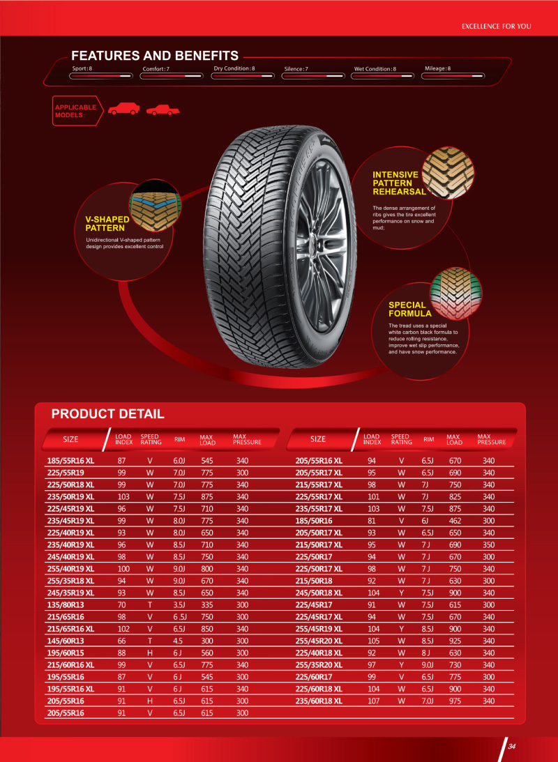高性能全季節(jié)輪胎,全新配方、單導向人字形花紋設計,操控性優(yōu)秀,雪泥地性能優(yōu)越,是一款綜合性極強的四季輪胎。