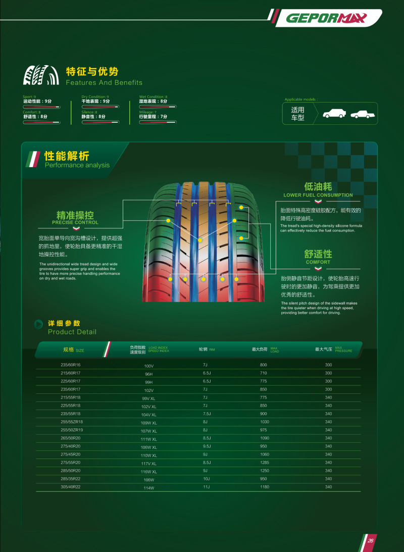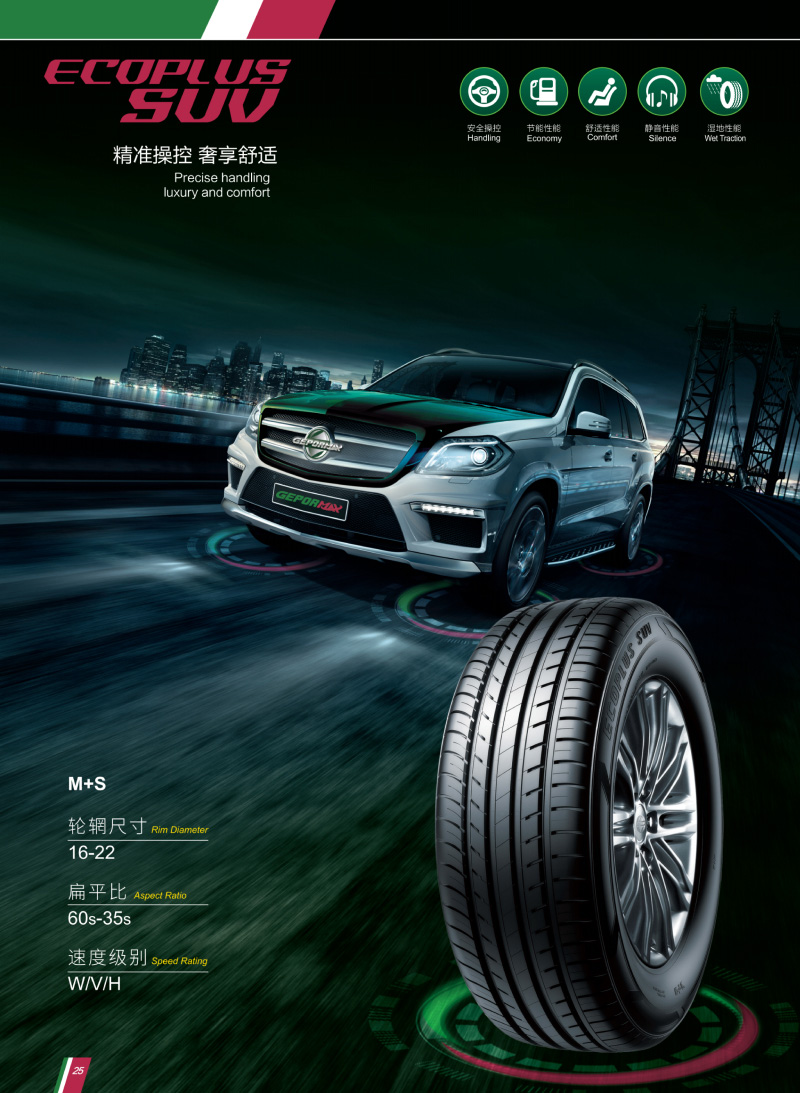 SUV專用輪胎,靜音胎面,超強(qiáng)抓地設(shè)計,精準(zhǔn)操控。